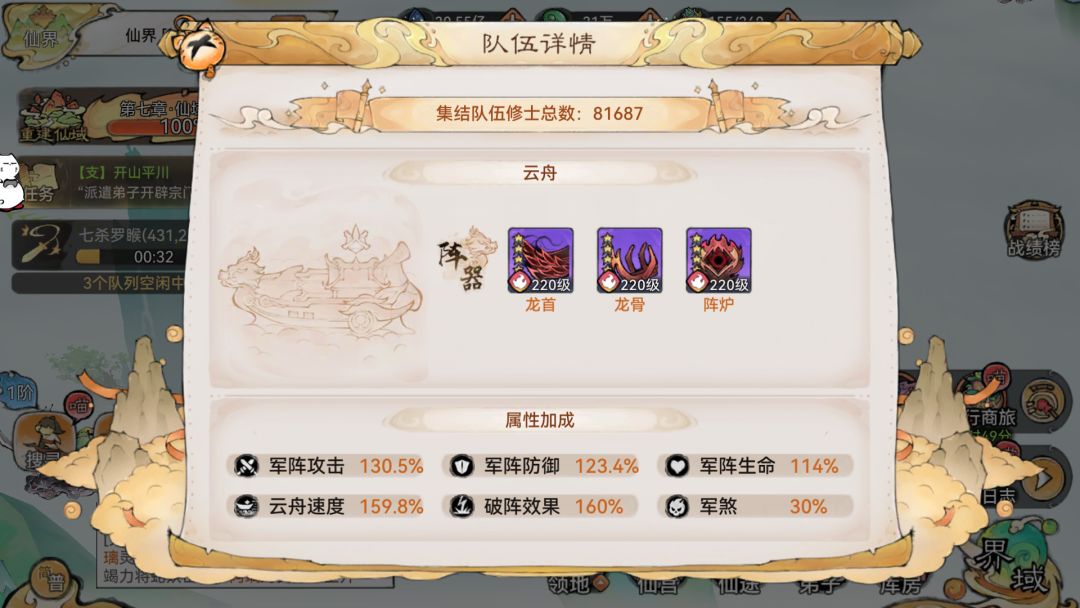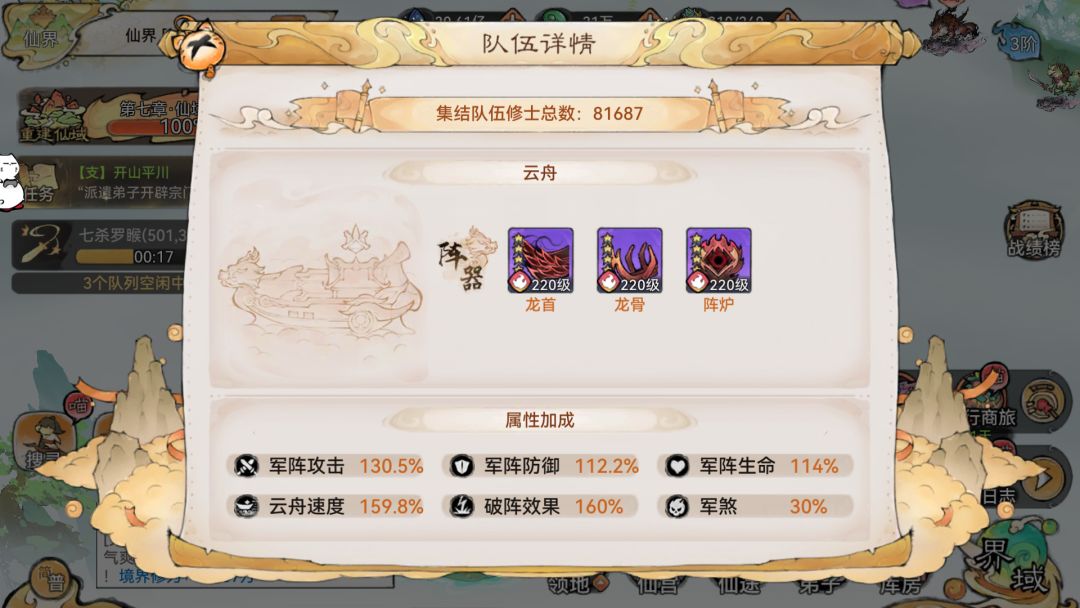 【玄机】效果:云舟出征弟子每个玉符灵阵总等级36级后,军阵共计+0.75%,之后没提升3级,军阵攻击额外+0.05%