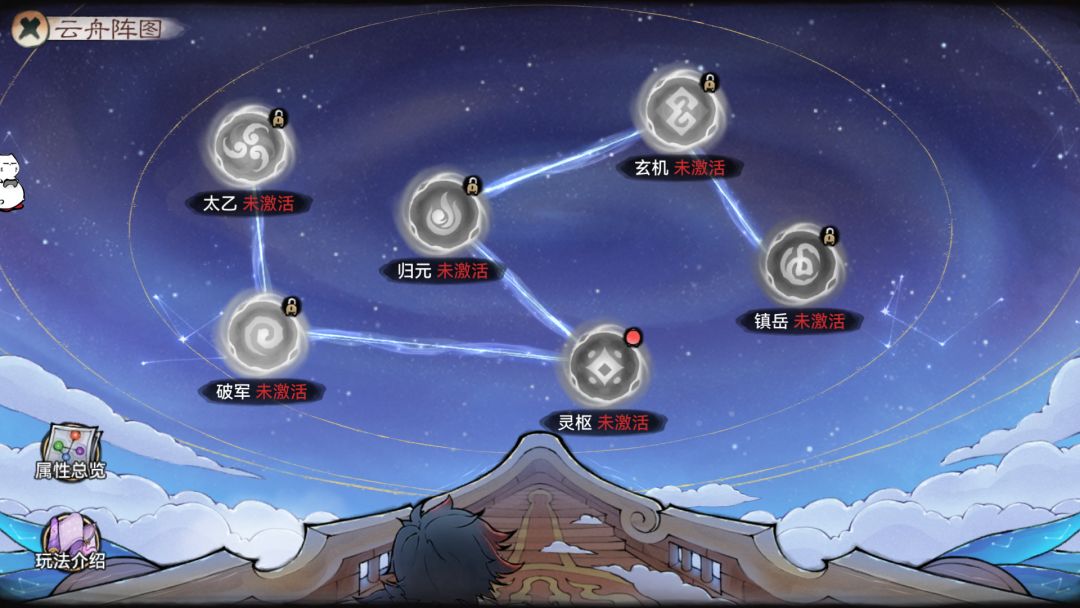 云舟阵图位于小船界面中,打开后可以看到分别有【太乙】【破军】【归元】【灵枢】【玄机】【镇岳】六个枢纽,通过解锁不同的枢纽可以让你的小船获得更高的属性加成,目前能够白嫖到的只有【灵枢】的碎片。