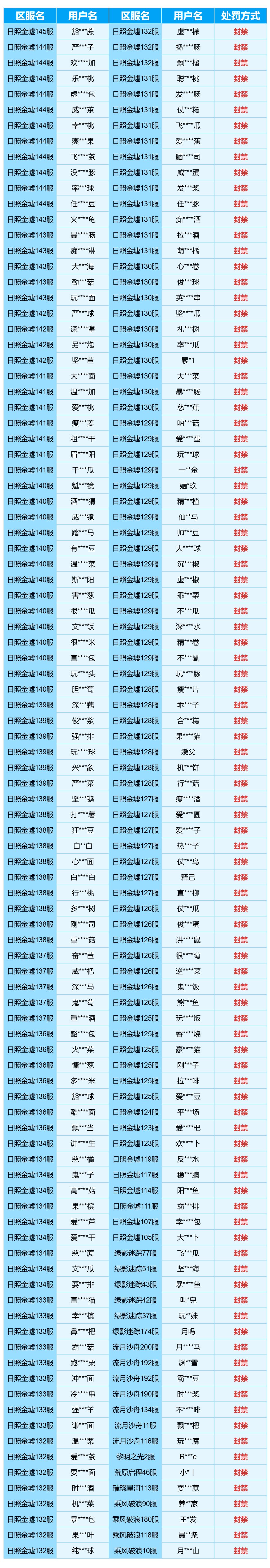 10月30日12:01至11月6日12:00期间,部分封禁名单公示:
