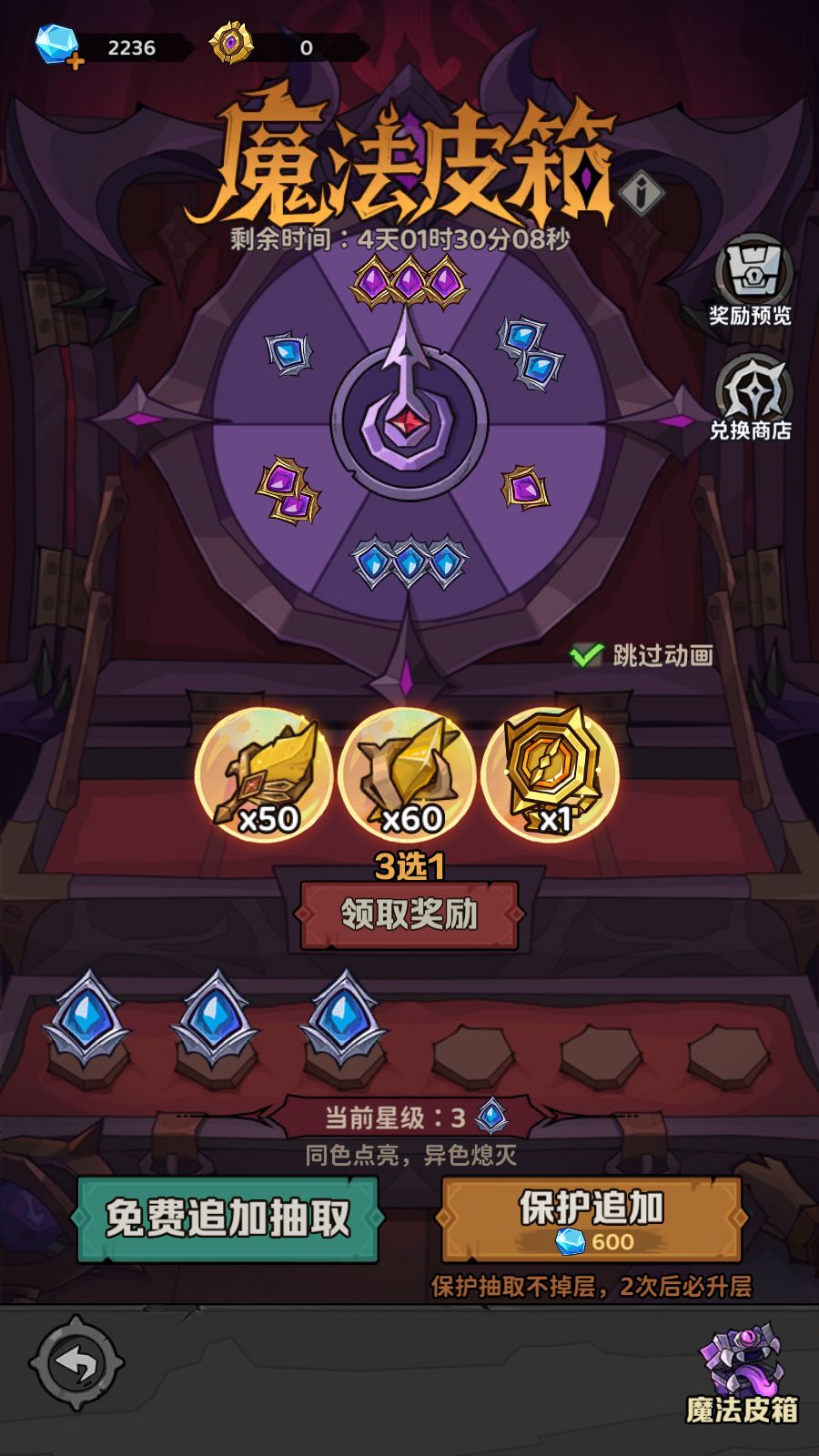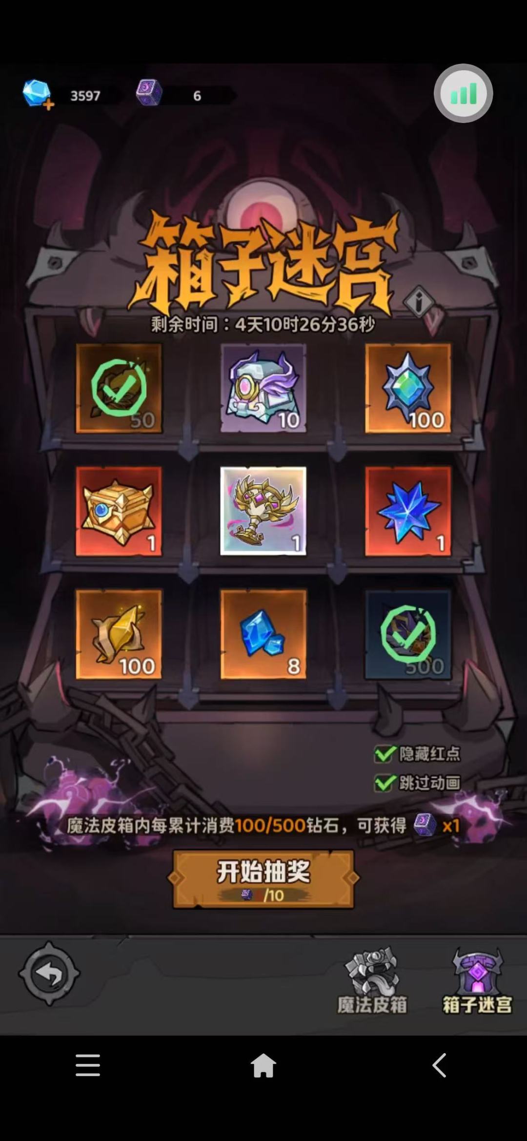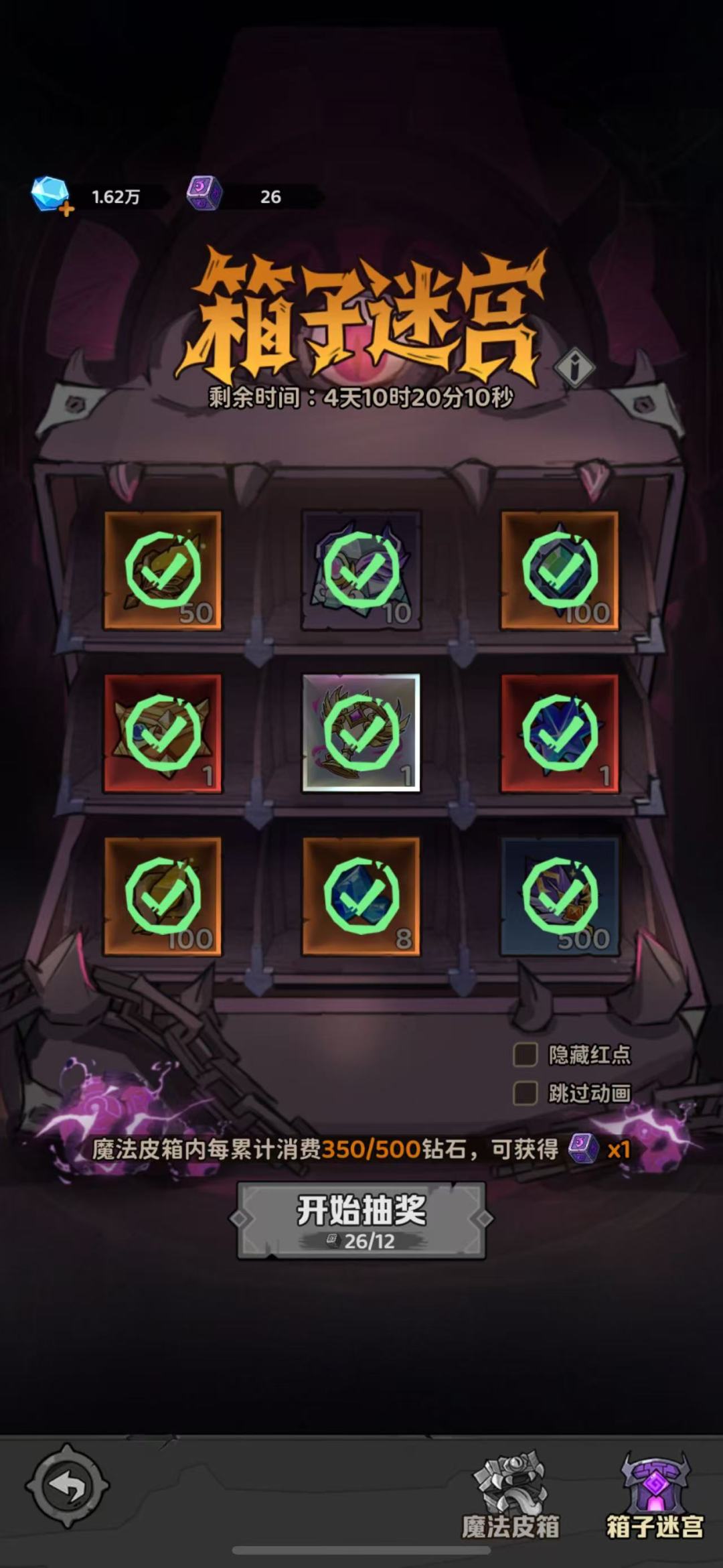 2,第二次魔法皮箱,迷宫中没有继承上次抽过的奖励,所有奖励重置了,但抽骰子的所需次数被继承了。比如上次的迷宫抽到8的时候中断了,在此轮中,第一次消耗骰子数就是9,且界面上也仅解锁一个奖品。