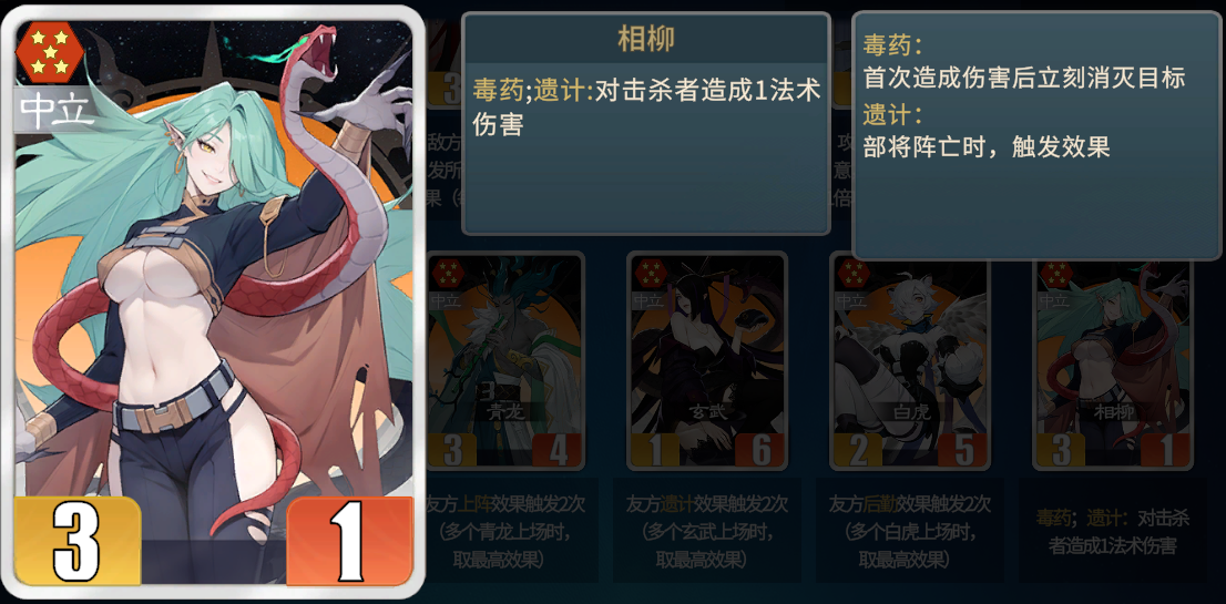 核心机制:自身攻击或被击杀触发遗计伤害,会因为毒药效果立刻消灭目标。