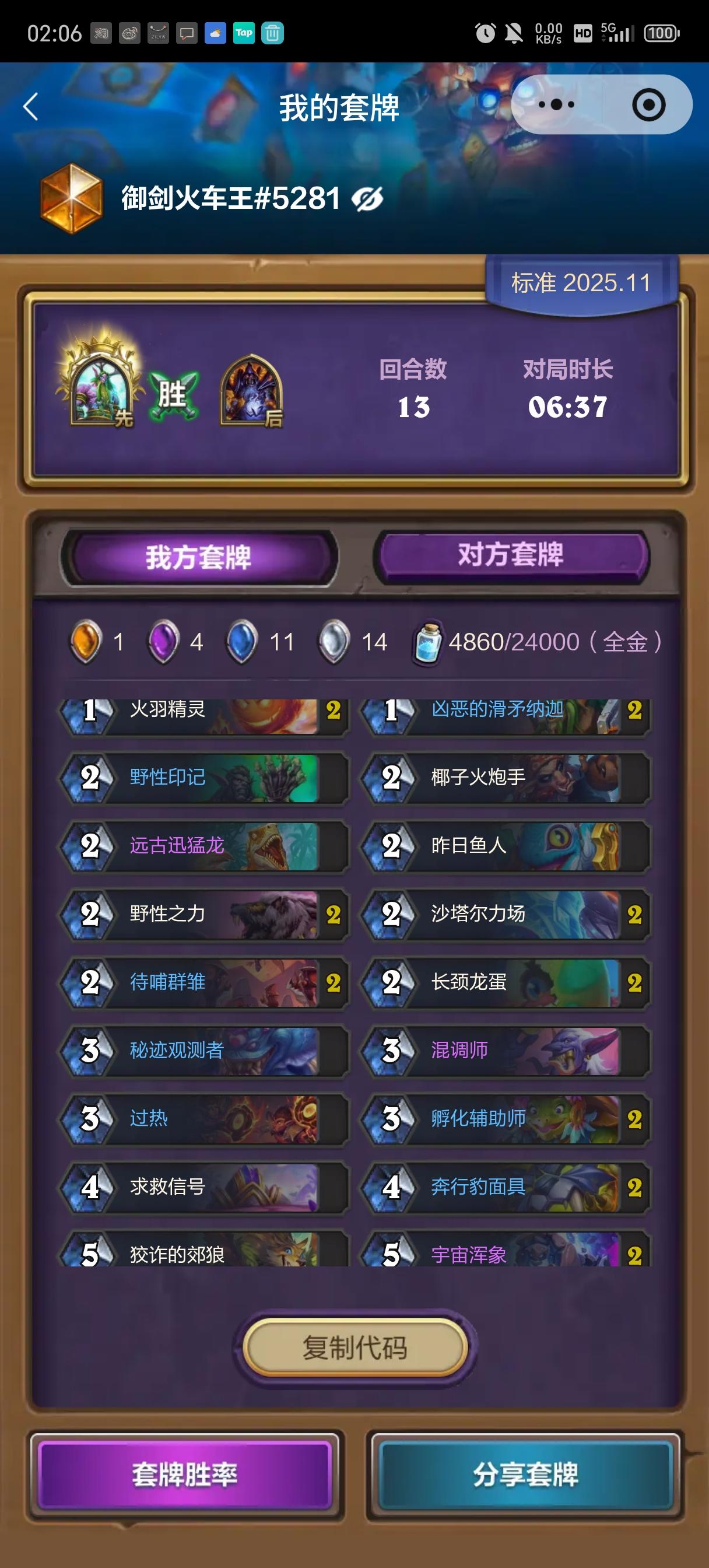 这位4费女巫+鱼人,5费摆件,6费来不及开流星雨的萨满