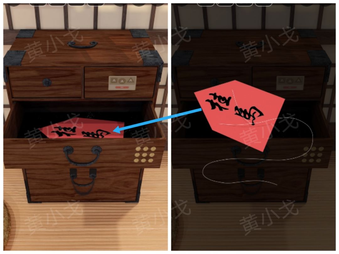 23.点击柜子第三层抽屉上的密码锁,根据[猴子]场景地上的卡牌形状及上面的人物性别,调整密码锁
