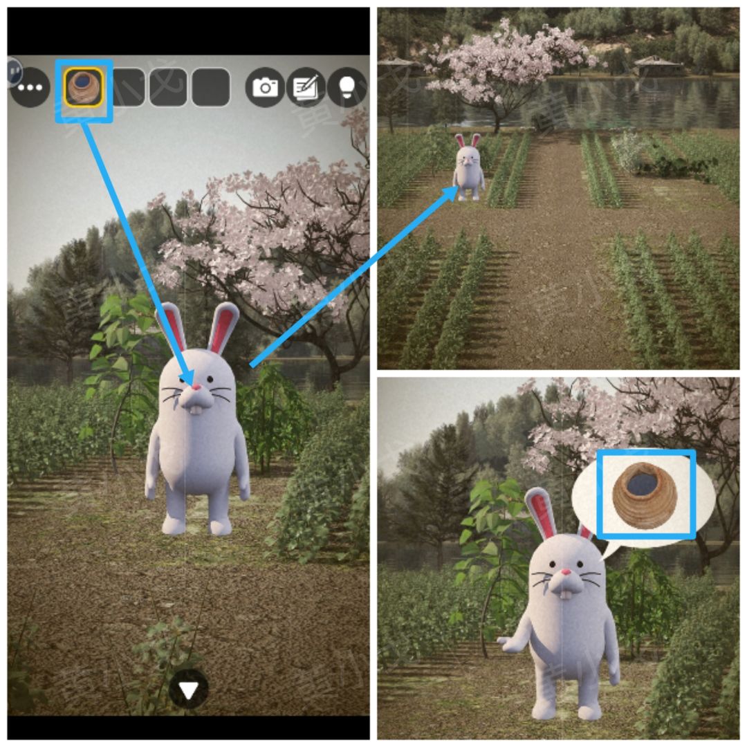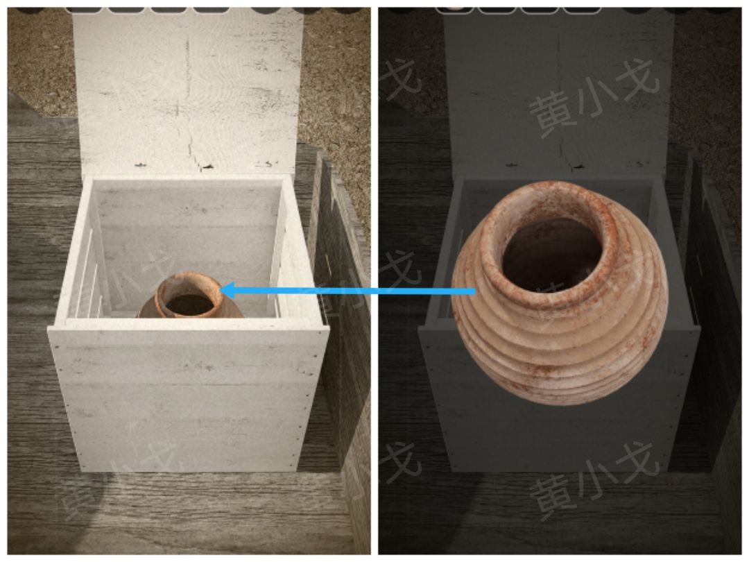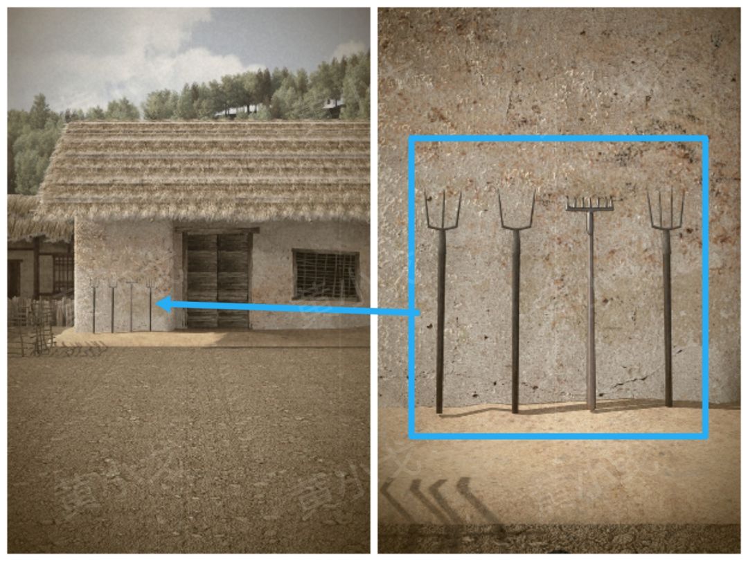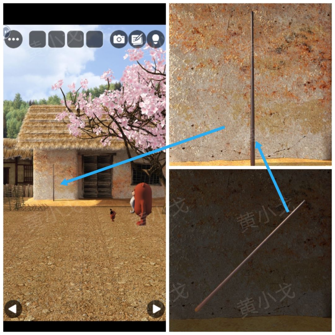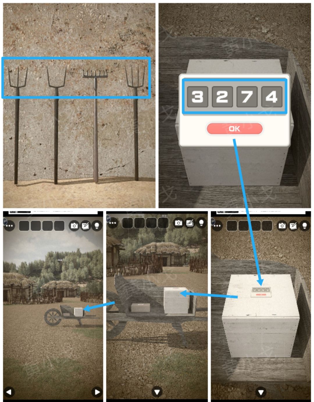 2.点击推车上的大箱子上的密码锁,根据[茅草屋外]耙具的耙齿数量,输入密码:3274