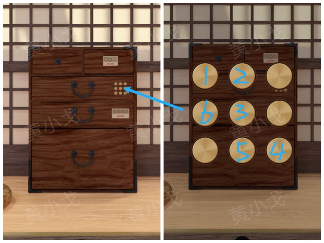17.点击第二层抽屉上的密码锁,根据[河边]青蛙跳在荷叶上的位置和 顺序线索,按顺序按下按钮