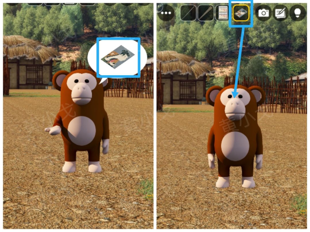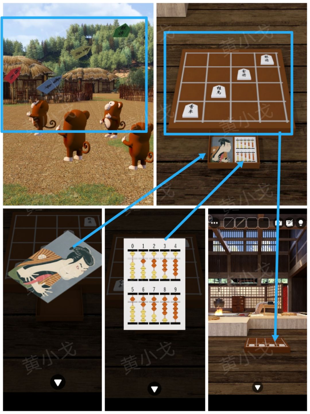 20.点击地上的棋盘,根据猴子们放飞的御守的高度和上面的文字线索,调整对应棋子的位置;打开暗格,获得【珠算表】和【卡牌】