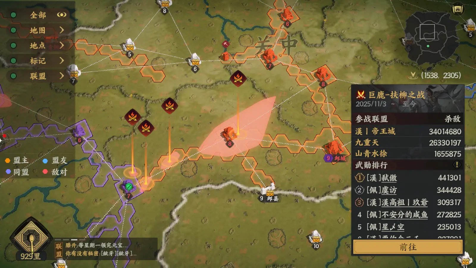 司隶核心战区的战火依旧炽烈!【九丨霄】与【黄泉霸业】的霸业对决持续白热化,双方寸土不让。【九丨霄】凭借实力稳占上风,而【凌云阁】则从侧翼出击,协助【黄泉霸业】进行牵制。尽管局势不利,但【黄泉霸业】与【凌云阁】的抵抗依然顽强。目前双方战役总兵损已高达6亿,且这个数字仍在持续攀升,这场消耗战何时终了,仍是未知之数!