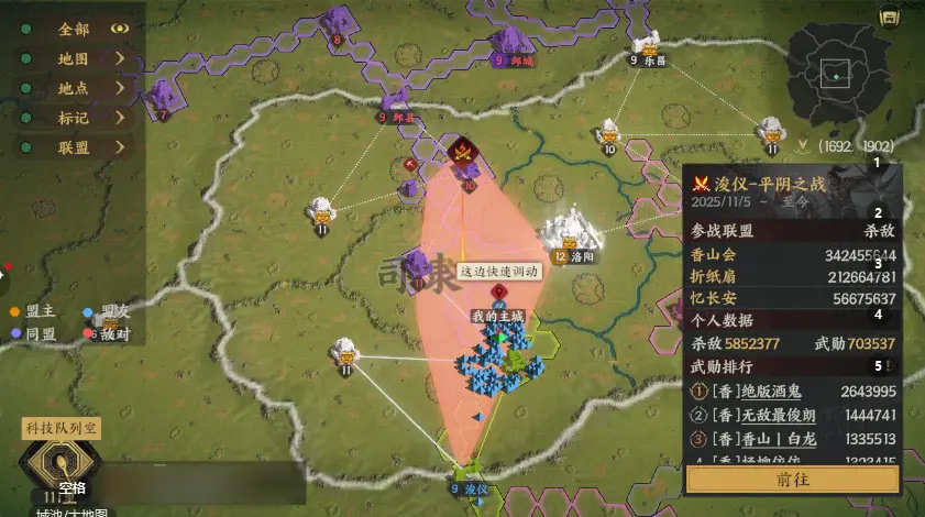 115区的司隶战场上演了一场精彩的战略博弈!【香山会】强势进入司隶,意图以一敌二。【折纸扇】在浚仪正面硬撼,成功牵制其主力;与此同时,【忆长安】精锐从朝歌潜入横穿洛阳,兵锋直指【香山会】的弘农腹地。一个精心策划的夹击之势已然形成,【香山会】将如何应对这来自东西两线的巨大压力?