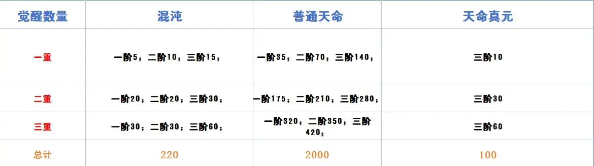 觉醒天命时共需花费三种材料:混沌天命灵魄、普通天命灵魄以及天命真元,所需数量分别为:220、2000、100