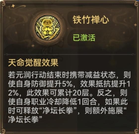 并且搭配第二重天命:铁竹禅心的效果可以频繁打出“净坛长拳”,持续为队友提供防御和效果抵抗加成。