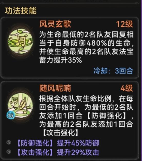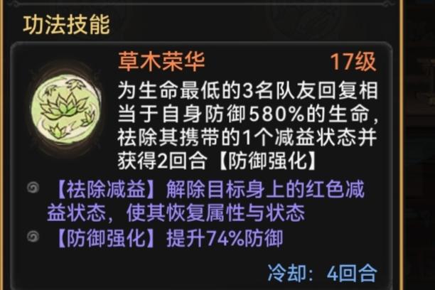 百花仙册主动技能可以为队友祛除减益,被动技能可以提升元润的效果抵抗和防御率,可以说是无比契合元润,并且两层“育种”后的复活也可以弥补元润无法携带“山海”“凤魂”等复活功法的短板。