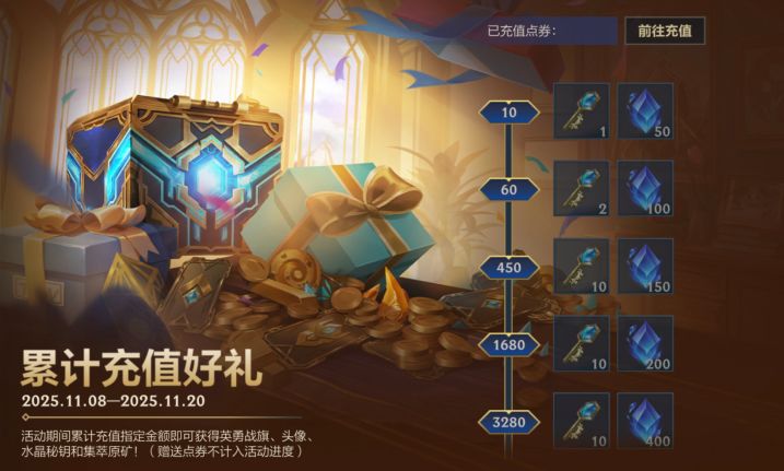 即日起至11月20日23:59,累计充值达到指定数量即可领取对应英勇战旗-两仪战旗、头像-霸道典狱长、水晶秘钥等奖励~