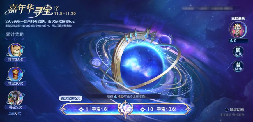 嘉年华寻宝 今日开启即日起至11月20日23:59,召唤师消耗290点券(首次60点券)购买1个英勇战旗-金牛战旗(30天)可额外获赠1个魔力星。使用1个魔力星即可寻宝1次,获取奖池内一款皮肤(优先未拥有),同时掉落至少29个宝物碎片,用以兑换额外珍稀奖励。快来一起“寻宝”吧~