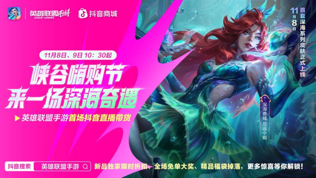 峡谷嗨购节来啦~11月8日(今日)-11月9日上午10:30,《英雄联盟手游》首场抖音直播带货火热开启,嘉年华寻宝和深海奇域活动礼包享独家折扣!
