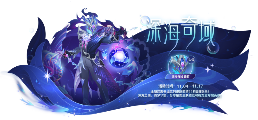 即日起至11月29日,召唤师可以通过参与“深海奇域”活动获取至臻 深海奇域 莫甘娜、深海奇域 莫甘娜、深海奇域 厄运小姐、深海奇域 凯尔、深海奇域 锤石、深海奇域 潘森新皮肤。
