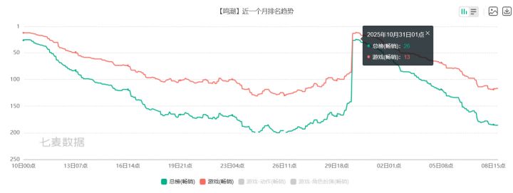 鸣潮此次新推出的仇远卡池,流水表现为总榜畅销榜排名第26名,游戏畅销榜排名第13名