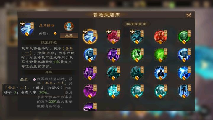 青鸟:武将出场时获得移动+2和20%暴击率的buff。战斗开始时对敌方全体造成20%我方武将最高血量的真伤,比较通用的神兽,全阵营都有提升,尤其魏国和蜀国阵容,适用pvp和pve常规战斗