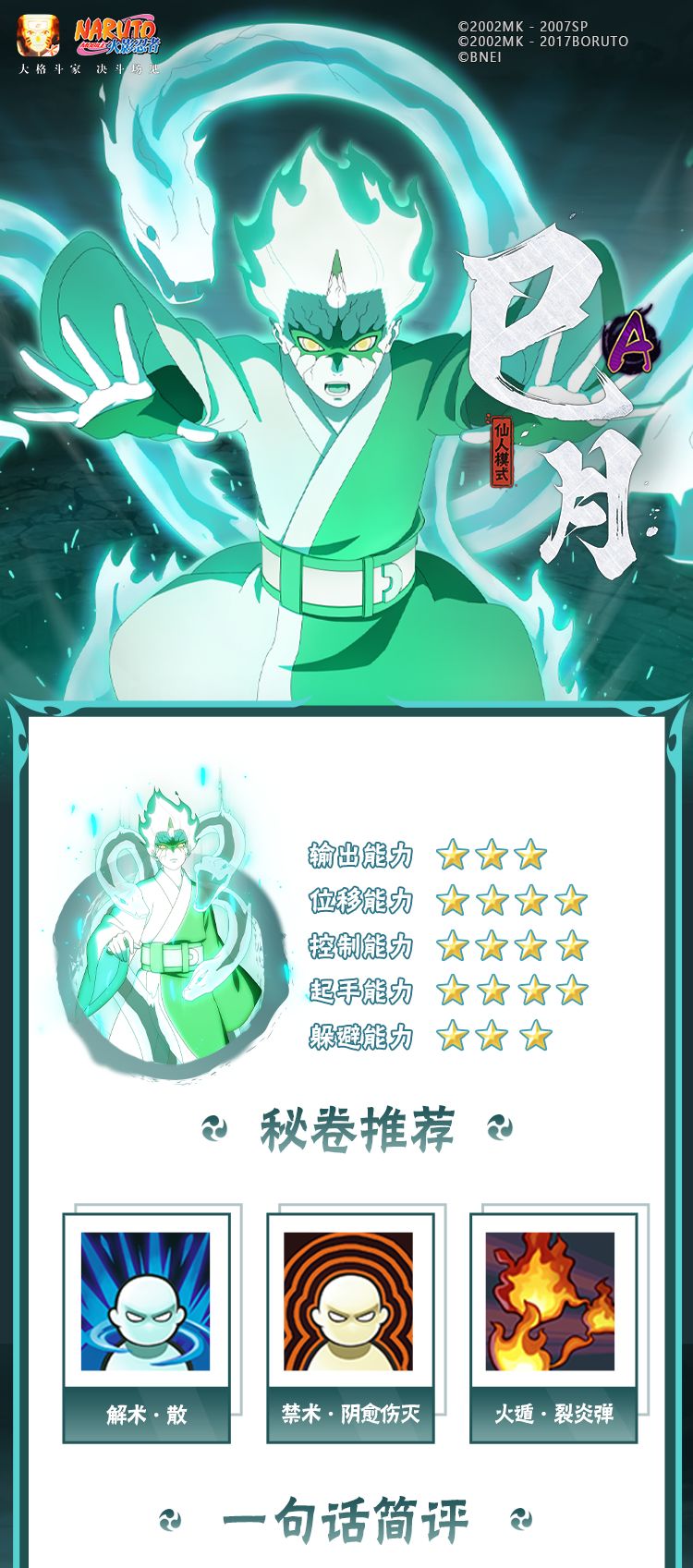 下强化技荒蛇可脱手释放,释放后会控制查克拉蛇持续追踪前方敌人,可追踪范围较远,可以摸奖攻击;最后查克拉蛇追踪到敌人撕咬时有扫地。