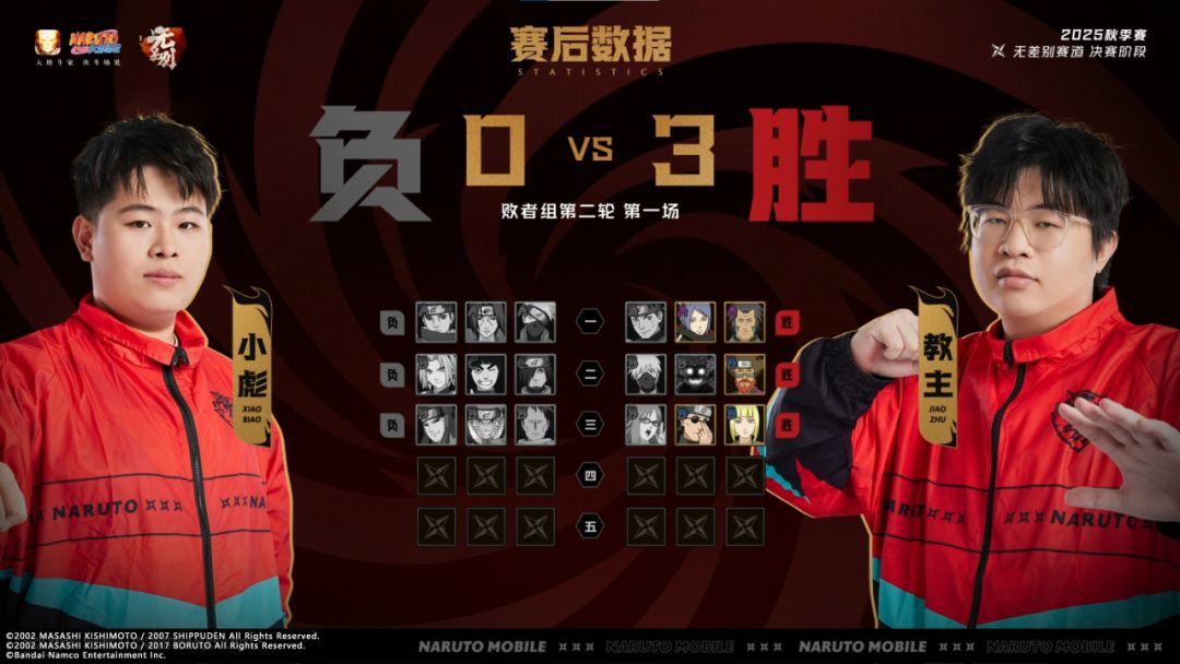 败者组第二轮第1场,小彪对战教主。第一局,教主的小南以灵活的走位和清晰的思路击败小彪;第二局教主的老紫「四尾人柱力」以技能优势打出高额伤害,获得胜利;第三局教主继续引领比赛节奏,并抓住小彪失误的时机,使用技能加奥义终结小彪,教主3:0小彪赢得胜利。