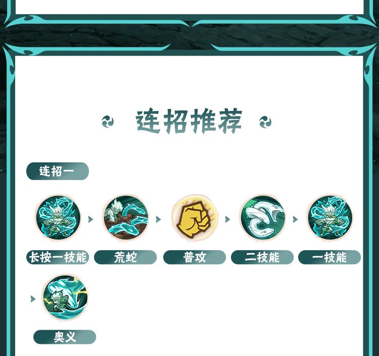 一技能图标上有三条查克拉蛇时,可先点按释放一段(消耗一蛇)快速起手,再一技能划普攻(消耗二蛇)连招攻击敌人;也可先一技能划普攻(消耗二蛇)拿到先手,随后点按释放三段(消耗一蛇),利用攻击距离较远的大蛇雷与敌人进行拉扯。划普攻时同样可按住普攻自由移动,并根据战况灵活松开追击敌人。