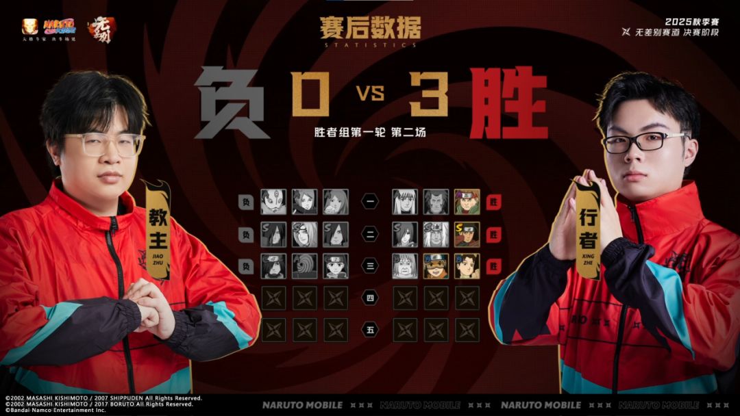 胜者组第一轮第2场,教主对战行者。第一局行者使用秋道丁次「忍界大战」以奥义终结教主,拿下第一局;第二局行者越战越勇,使用千手柱间击败教主;第三局行者的宇智波带土「少年」多次精准抓到教主的走位,最终行者3:0零封教主获胜。