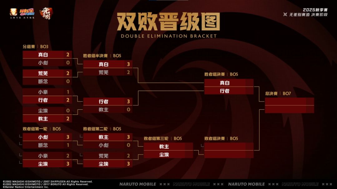 2025《火影忍者》手游秋季赛总决赛首日的无差别赛道分组赛中,真白、荒芜、行者、教主进入胜者组,小彪、断念、小豪、尘埃则落入败者组。胜者组中,真白和行者晋级胜者组决赛;而在败者组,断念、小豪、小彪、荒芜遗憾淘汰,教主、尘埃最终晋级败者组第三轮。