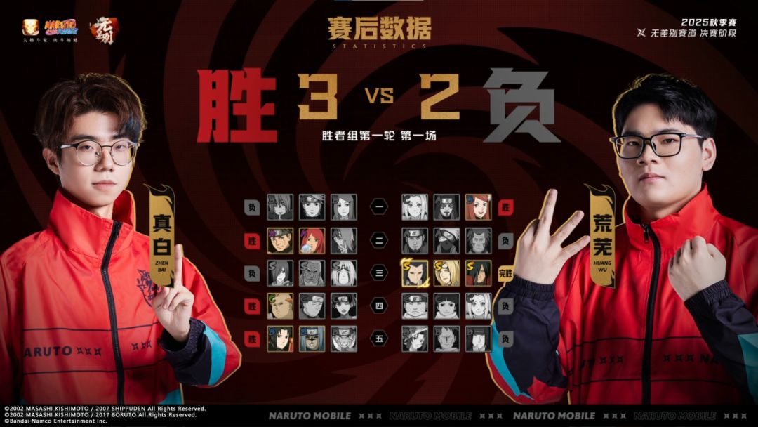 胜者组第一轮第1场,真白对战荒芜,双方先后拿下一局;随后荒芜的三代目风影「秽土转生」轻松穿三拿下第三局;第四局真白的次郎坊「秽土转生」在血量劣势下绝地反击,扳回一局;第五局真白抓住荒芜的失误,连续击败荒芜的两名忍者。最终真白3:2荒芜拿下胜利。