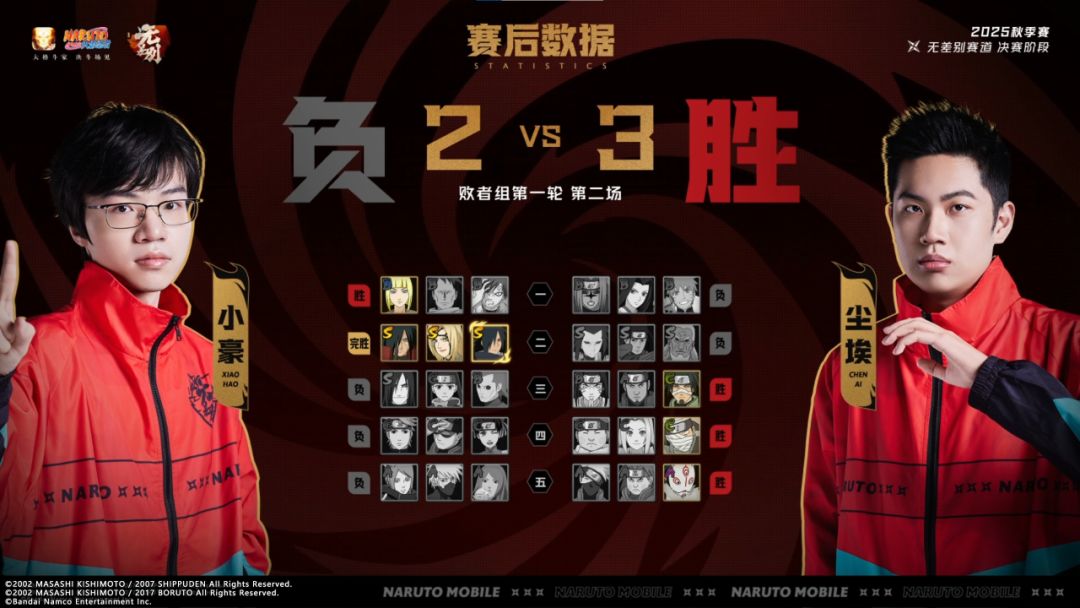 败者组第一轮第2场,小豪对战尘埃。小豪稳定发挥,连胜两局;第三局尘埃以猿飞阿斯玛连斩小豪的两名忍者,随后使用钢子铁终结小豪;第四局尘埃释放秘卷顶掉小豪的奥义,随后释放奥义接技能轻松击败小豪;第五局尘埃打出巨大血量优势,拿下第五局。最终尘埃3:2小豪拿下胜利。