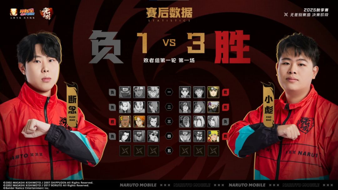 败者组第一轮第1场,断念对战小彪。小彪使用保底忍者希,技能先手多次抓到断念的走位,拿下第一局;第二局双方互换两名忍者后,小彪使用秘卷躲开断念释放的奥义,并抓住机会追击,赢下第二局;第三局断念追回一分,但接下来小彪手感火热赢下第四局,最终小彪3:1断念赢得胜利。