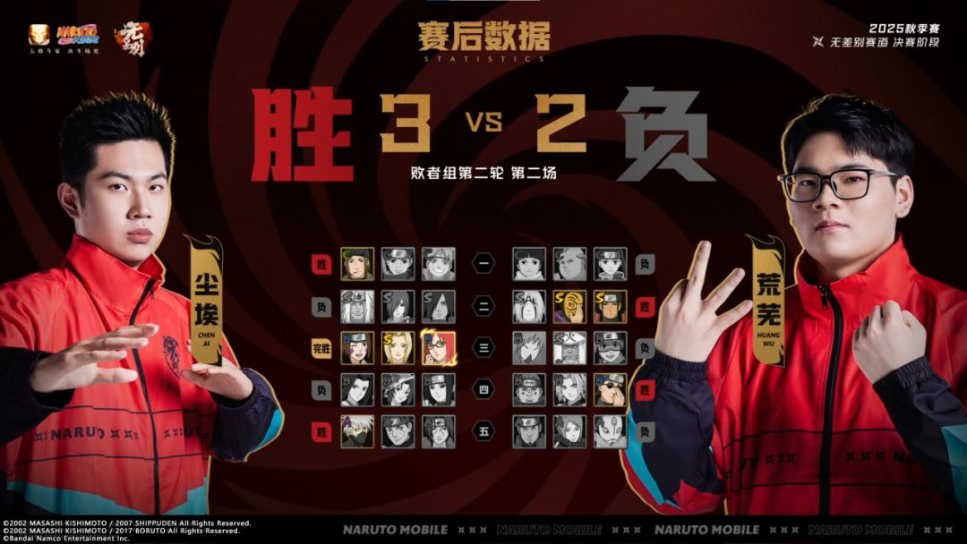 败者组第二轮第2场,尘埃对战荒芜。双方不分伯仲,各自拿下一局;第三局尘埃使用香燐「冬日限定」以技能先手和压场优势取胜;第四局尘埃被打至血量劣势,随后荒芜使用惠比寿轻松击败尘埃;第五局尘埃的旗木卡卡西「万花筒写轮眼」多次躲开荒芜的攻击,最终以技能加奥义终结荒芜。尘埃3:2荒芜拿下胜利。