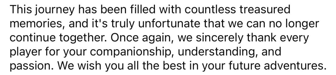 这段旅程充满了无数珍贵的回忆,我们无法继续携手前行,实在令人惋惜。再一次衷心感谢每位玩家的陪伴、体谅与热情。祝福你们在未来的冒险中一切顺利。