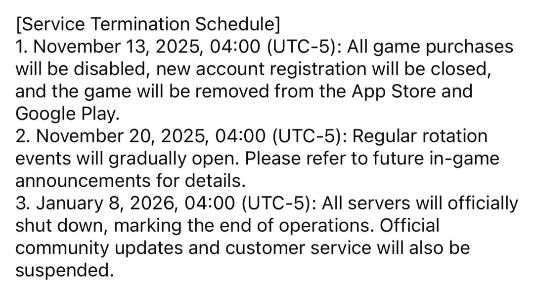 1. 2025年11月13日04:00(UTC-5):游戏内所有购票功能将关闭,新账号注册功能将停止,游戏将从 App Store 和 Google Play 下架。