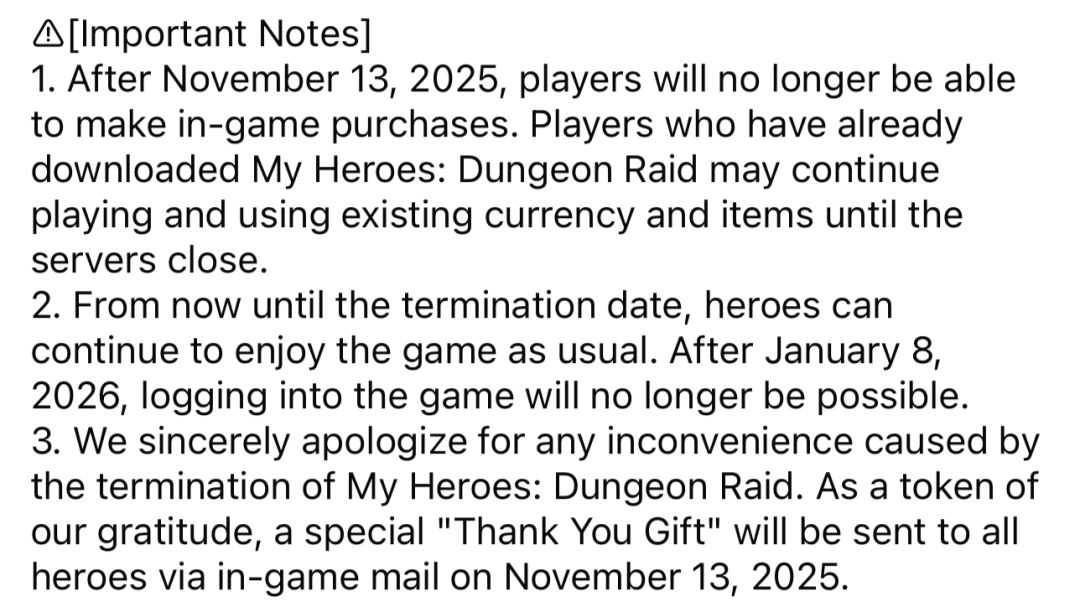 1. 2025年11月13日之后,玩家将无法进行游戏内购买。已下载《我的勇者:地下城突袭》的玩家可以继续游戏,并在服务器关闭前使用现有货币和道具。