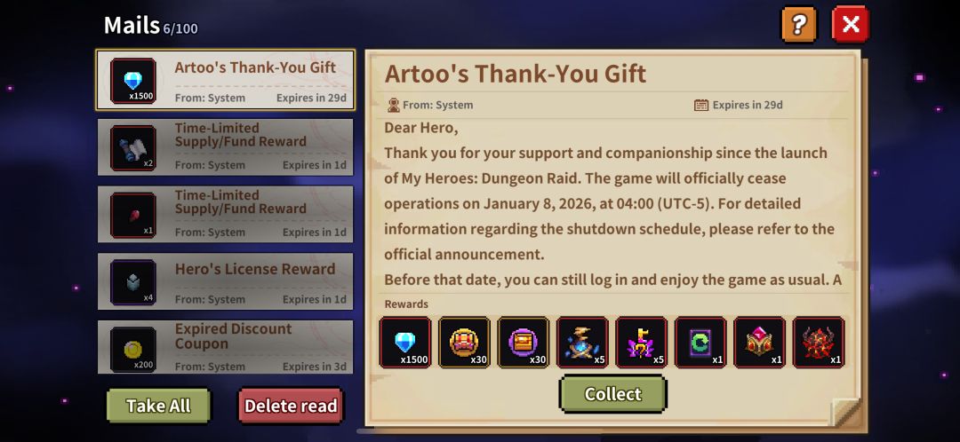 3. 对于《我的勇者:地下城突袭》终止运营给您带来的不便,我们深表歉意。为了表达我们的谢意,我们将于2025年11月13日通过游戏内邮件向所有勇者发送一份特别的“感谢礼物”。