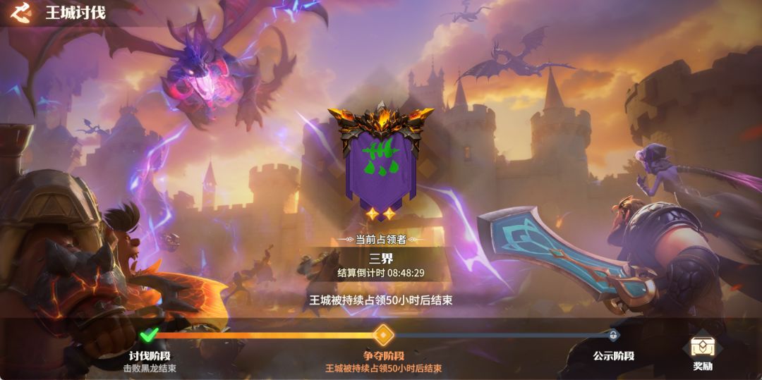 本赛季,以【三界】为核心的联盟体系,联合【鸿图之志】、【光武之兴】,历经多轮激战,最终击败由【吹梦到西洲】系与【恭喜发财帝国】【龙十帝国】组成的联合阵营,成功掌控王城。