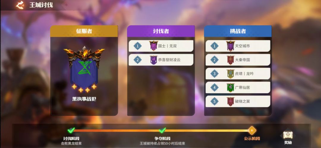 「沙丘奇兵」剧本王城开放后,各区服联盟纷纷集结大军,攻占王城。经过多个剧本的沉淀,各盟攻占王城时间差距不大,其中【CGC丶黎明】以4分13秒的速度拿下第一!
