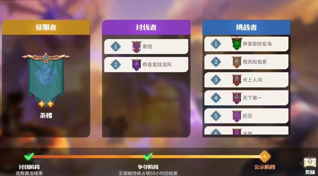 【茶楼】拿下王城宝座,其二盟【茶馆】与【恭喜发财凌风】分别拿下卫城。自此,【茶楼】系联盟问鼎中原,其盟友稳固四方,共掌全区格局!