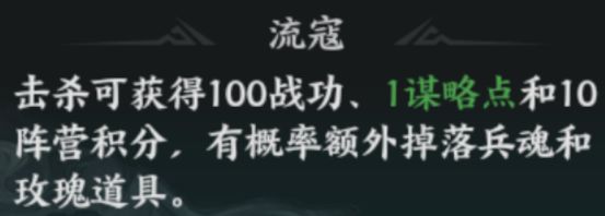 B. 清理流寇:击杀可获得100战功、1谋略点和10阵营积分,有概率额外掉落兵魂和玫瑰道具。