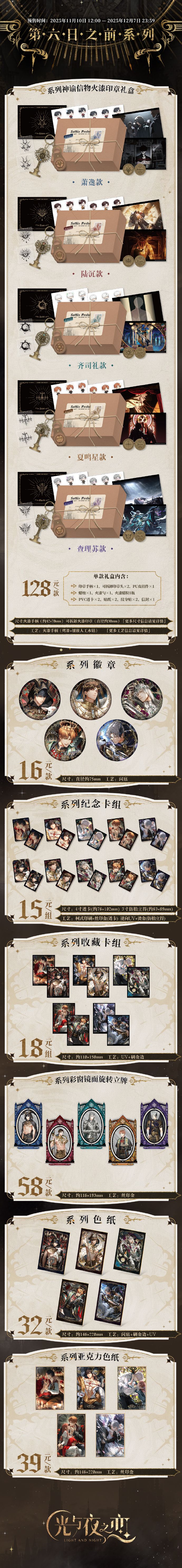 #光与夜之恋#官方周边商城已上线,第六日之前、银海一梦和玎玲小夜曲、Morning Bliss、危机考验系列限时周边,将于11月10日12:00正式开售,设计师可以移步微信小程序或天喵商城进行选购。