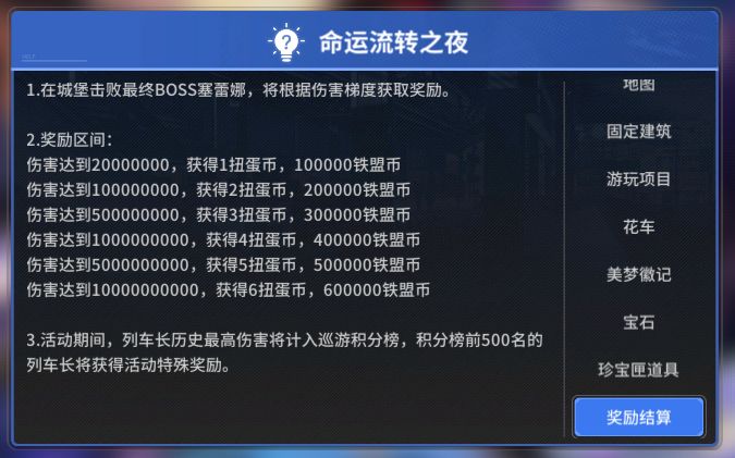 主要奖励在扭蛋机里就能看到,包括抽卡券、皮肤、UR、车皮、材料等。