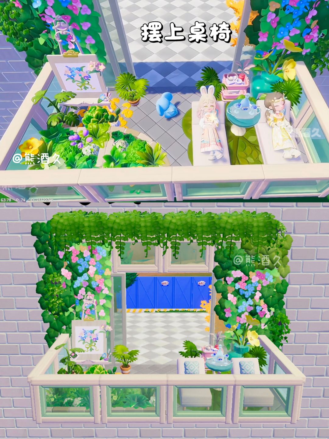主要建材家具:凇林采光窗、金属落地窗、墙生薛荔、爬墙虎、墙生三角梅、银杏落叶堆、小鸟地毯、底座草胡椒、底座蒲葵、月见草盆栽、方形花坛、扇形花坛、极简躺椅、浅境琉璃茶几、典雅复古画板、好时光手推车。