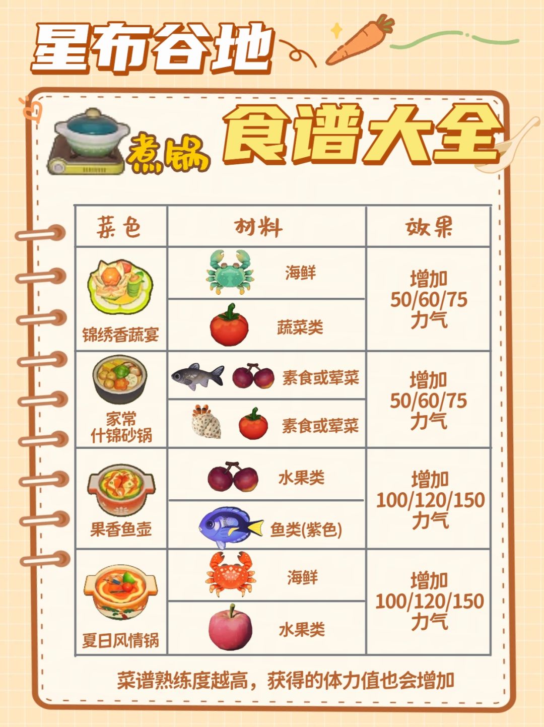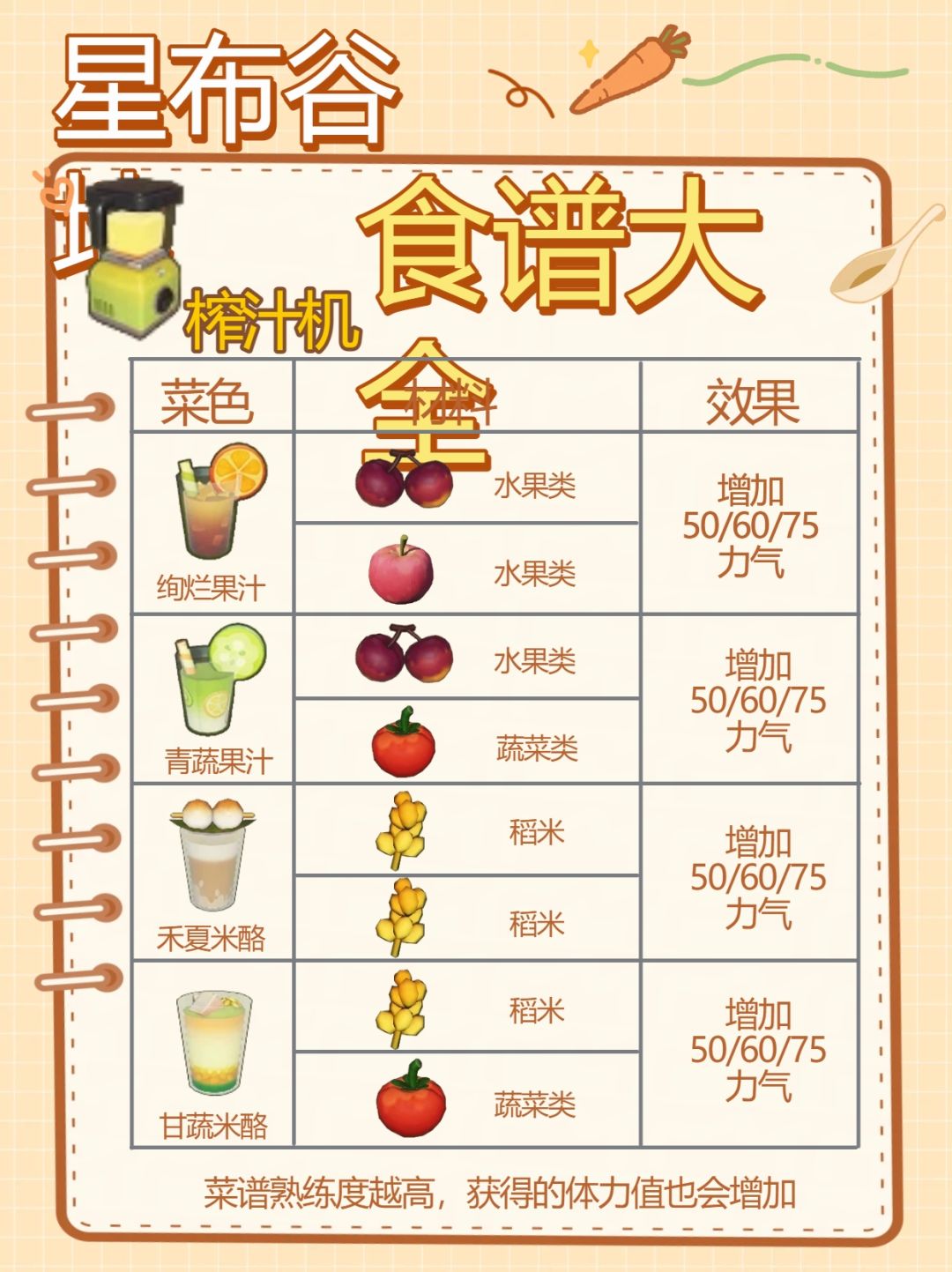 每道菜谱熟练度越高,获得的体力值也会增加哦
