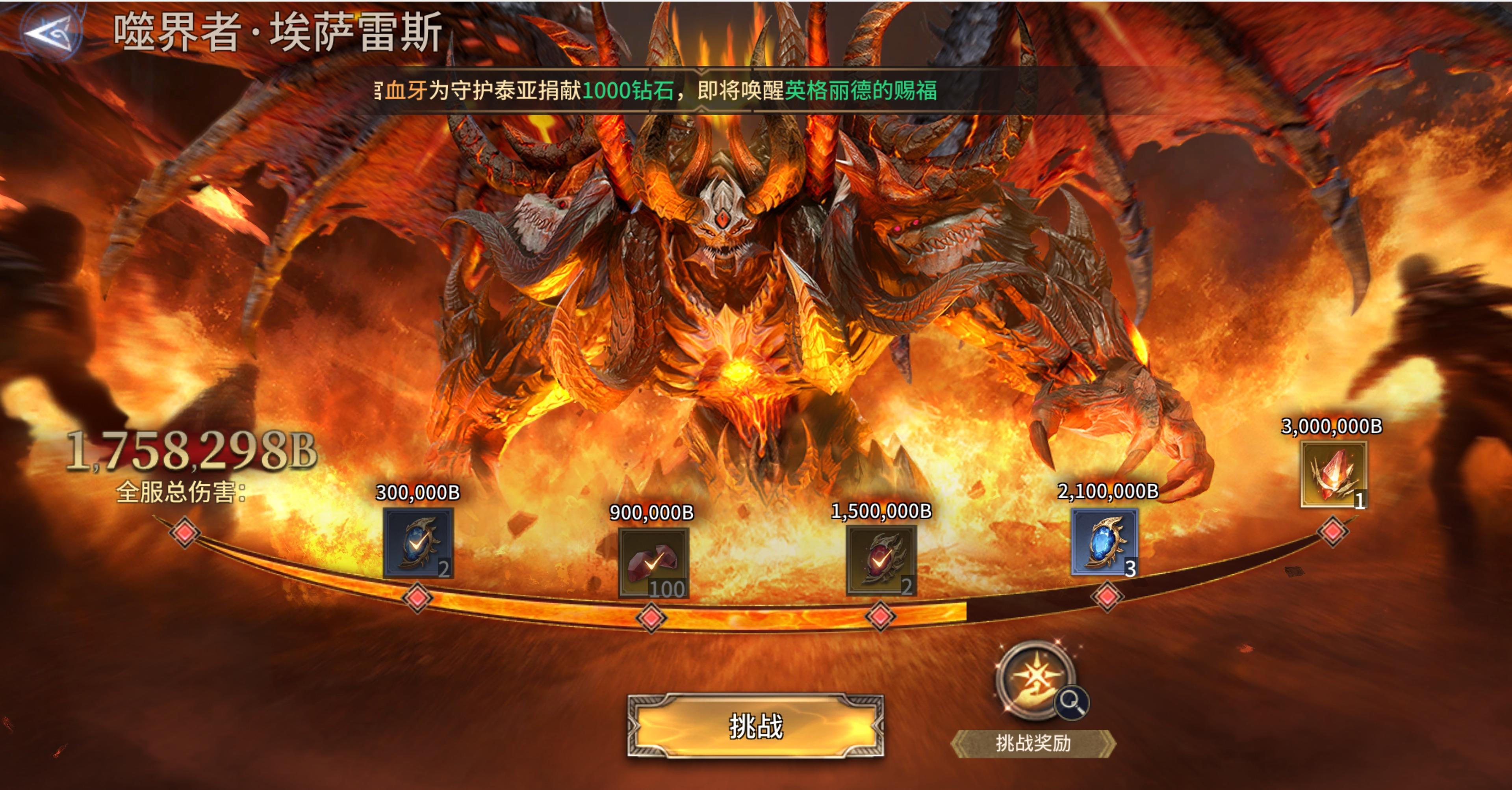 成功击败噬界者·埃萨雷斯,全服玩家即有机会赢取【随机五星传说英雄】及海量游戏奖励!