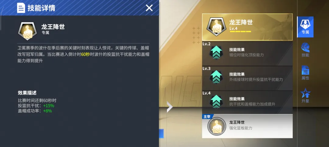 ● 4级专属:在比赛最后60秒时,波什投篮抗干扰增加15%,盖帽成功率增加8%,危难时刻方显龙王本色!越是最后时刻,越不可掉以轻心。防守端盖帽加成有效遏制对方濒死反扑,进攻端则更是锦上添花,结合多重加成,让最后一分钟的波什一旦持球,就像个战神!