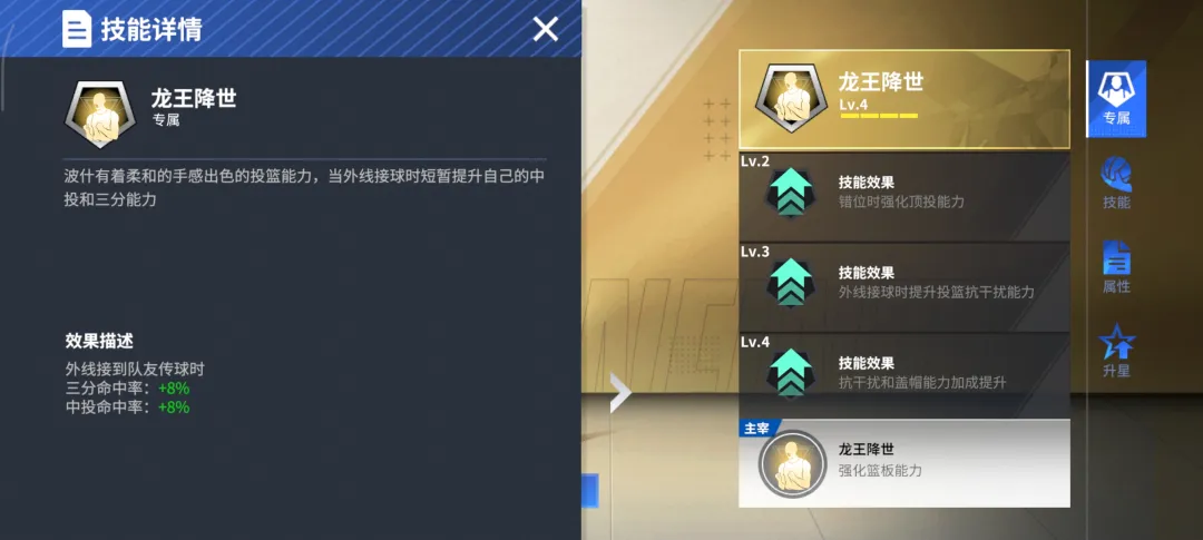 ●3级专属:外线接到队友传球时,三分、中投命中率提升8%,作为热火时代的强力空间高炮台,波什的空间进攻能力一流,同时结合自身强势的三分中投与接投大师属性,一旦让波什跑出空位,威胁能力不亚于顶尖射手!