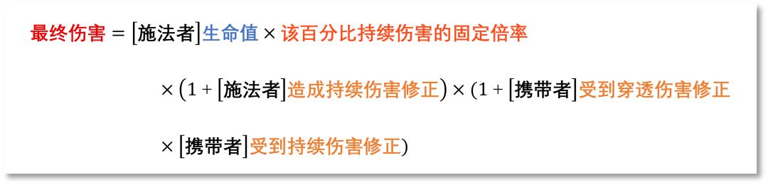 2.5-2.6中介绍的是持续伤害的计算方法,其计算方式与即时穿透伤害稍有不同。[持续伤害]是穿透伤害的一种,包含以下减益所造成的伤害: 灼烧、感染、圣痕、蚀炎、指控、伤痕撕裂、生命流失等,其中生命流失又包括点燃、冻伤、次级冻伤和其他种类的生命流失等。每当施加[持续伤害]时,均视为施法者对携带者施加减益,除[感染]之外,每个持续伤害的效果独立计算。在[持续伤害]生效时,会根据对应施法者此时的状态结算伤害。[持续伤害]一律不考虑职能克制关系的影响,且只会与施法者身上的[造成持续伤害]提高/降低(倒吊人塔罗等)、敌人身上的[受到穿透伤害提高/降低](穿透易伤、恋人塔罗等)和[受到持续伤害提高/降低](易伤-持续伤害、厄运共鸣等)叠加生效,而不会受到施法者身上的[穿透伤害提高](穿透增伤等)类增益的影响。