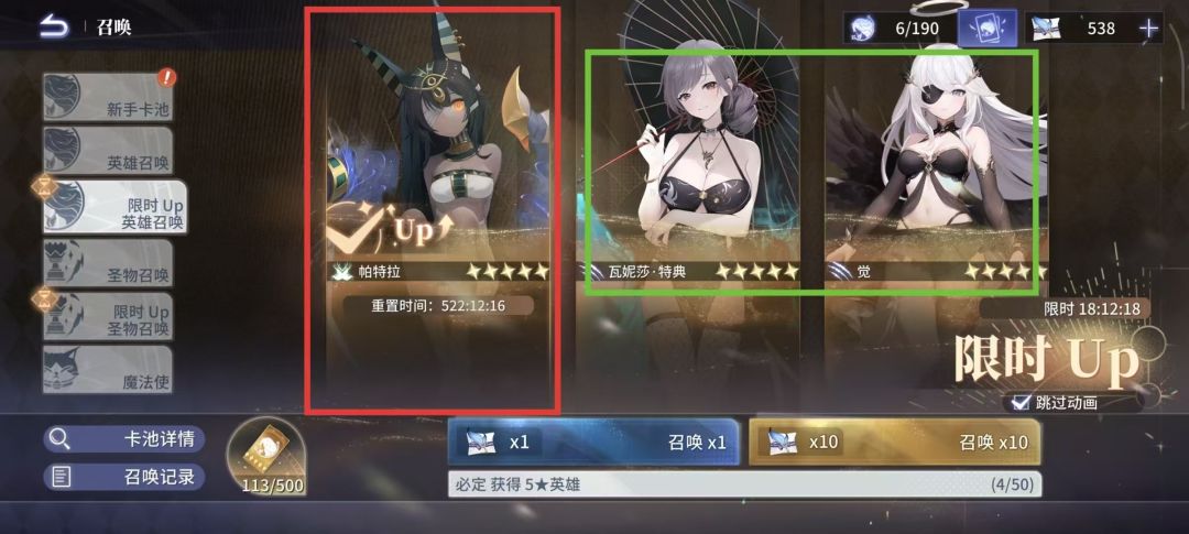 自选up角色选 帕特拉(24天重置一次)至少抽到1个,红色方框为up角色自选,绿色的方框为全部五星角色每日轮换,基本上一个月会将所有的五星角色都轮换一遍。(可以等需求的角色轮换到的时候再抽。)