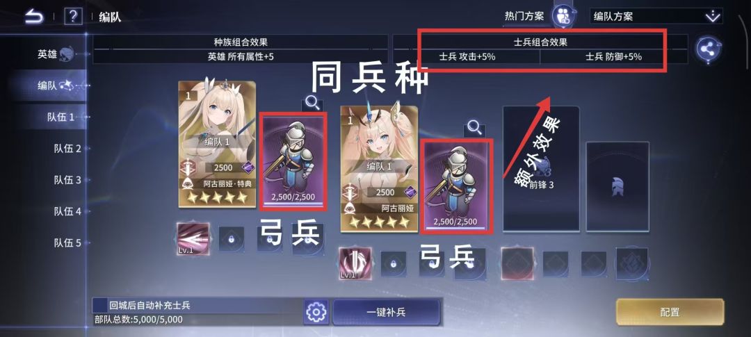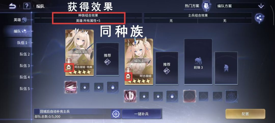 打白嫖队将圣女辛sp设为1兵放到1号位,将帕特拉放到3号位,记得在编队页面设置【回城自动补兵】,统领1兵。(白嫖队原理往后看)