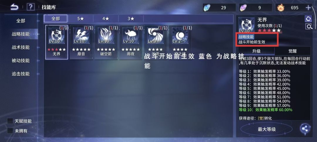 2、相同种类的技能所造成的相同技能效果无法叠加,例如2个战略技能的造成伤害增加效果,只取最大值生效
