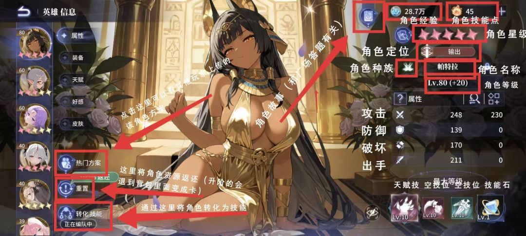 注:三个角色的技能优先升级【天赋技能】、不要担心消耗,所有角色相关的重置都是无损免费100%返还的,你有无数次试错机会。